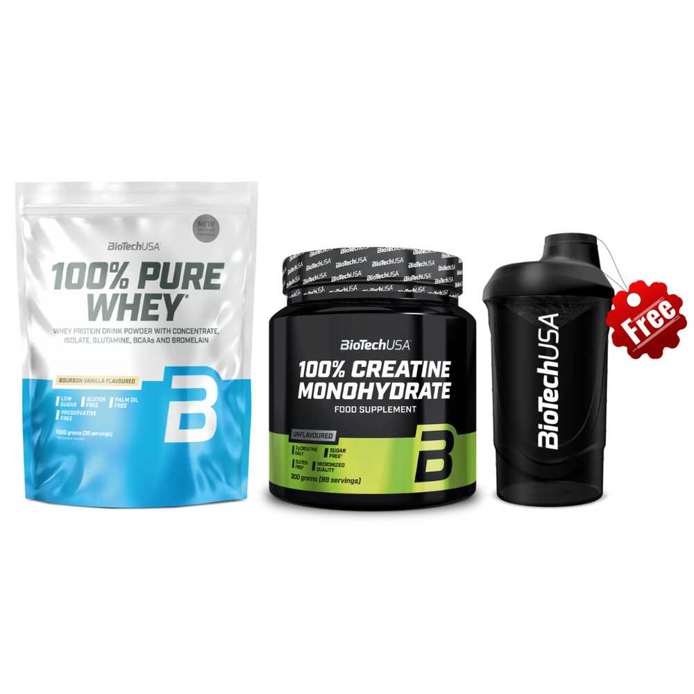 Biotech USA Set (100% Pure Whey Choco 1000gr, Micronized Creatine 300g & Δώρο Shaker Wave Black 600ml)