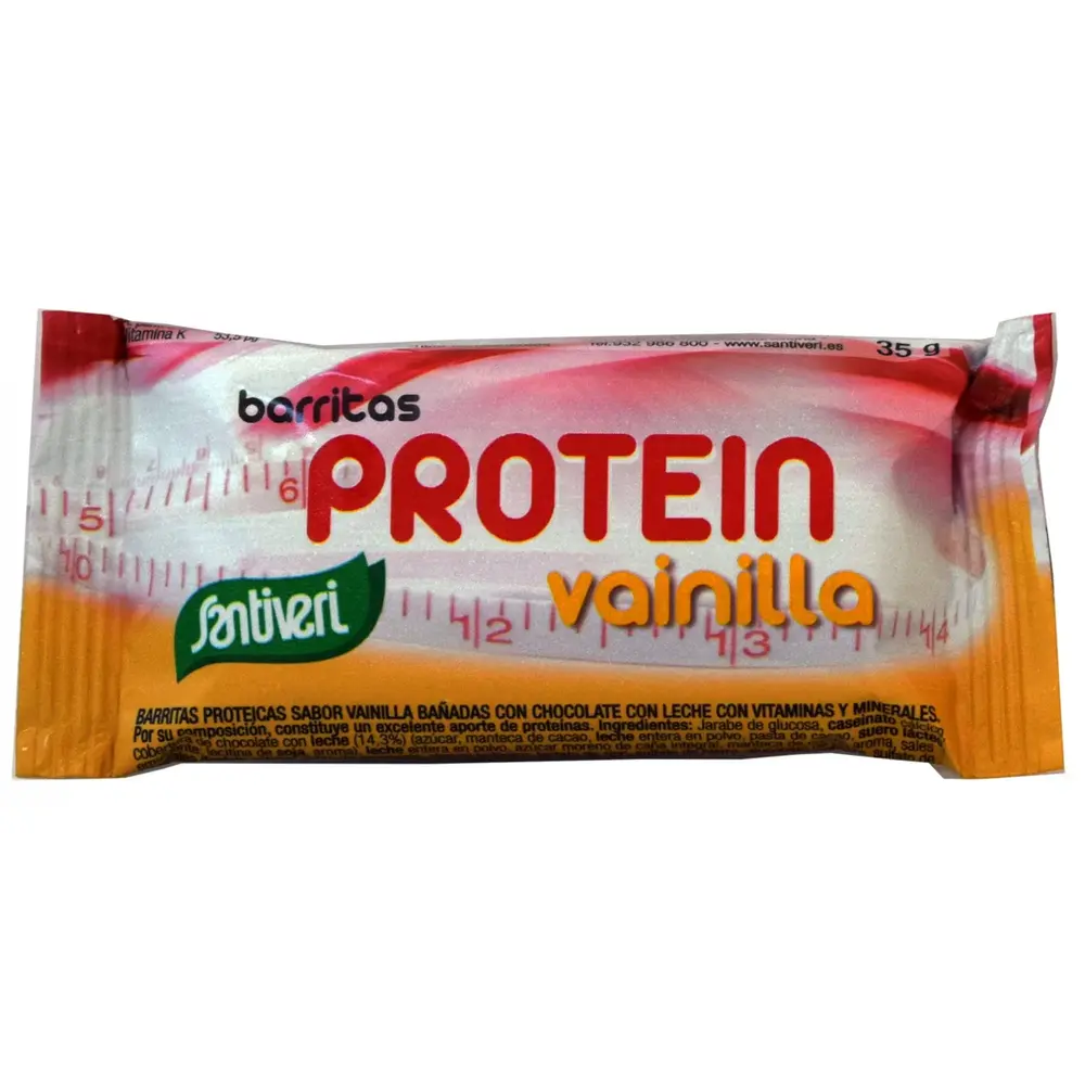 Μπάρα Πρωτεΐνης με βανίλια, το απόλυτο σνακ για αθλητές ή για αυτούς που θέλουν να έχουν μια ισορροπημένη διατροφή. Οι μπάρες Santiveri περιέχουν υψηλή περιεκτικότα σε πρωτεΐνες και βιταμίνες. Η βάση τους είναι η πρωτεΐνη γάλακτος. Η κάθε μπάρα περιέχει 7% καθαρή πρωτεΐνη και προσφέρει το 70% της καθημερινής συνιστώμενης δόσης (RDA) για τον οργανισμό σε vit A,D,C,E , θιαμίνη, νιασίνη, ριβοφλαμίνη, φολικό οξύ,Β12, παντοθενικό οξύ. 25% σε ασβέστιο, μαγνήσιο, χρώμιο, μαγγάνιο, σίδηρο, ιοδίνη, κάλιο.