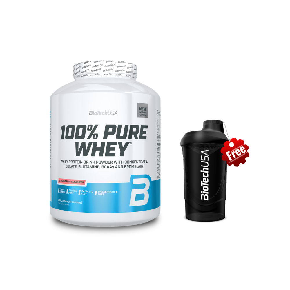 Biotech USA 100% Pure Whey Πρωτεΐνη Ορού Γάλακτος Χωρίς Γλουτένη με Γεύση Φράουλα 2.27kg & Δώρο Shaker Wave Black 600ml