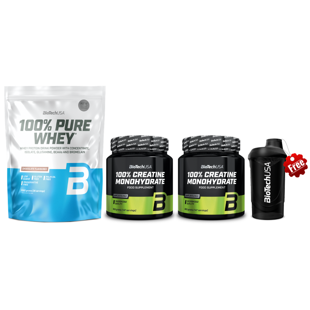 Biotech USA Set (100% Pure Whey Chocolate 1kg & Micronized Creatine 2x300g & Δώρο Shaker Wave Black 600ml)