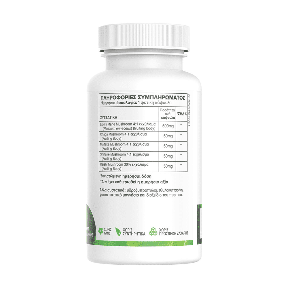 Το Lion’s Mane Complex, της Green Forest είναι ένα προηγμένο συμπλήρωμα διατροφής που συνδυάζει το εκχύλισμα του μανιταριού Lion’s Mane (Hericium erinaceus) με προσεκτικά επιλεγμένα φυτικά εκχυλίσματα και βιταμίνες, προσφέροντας ισχυρή υποστήριξη στη γνωστική λειτουργία, τη μνήμη και τη συγκέντρωση. Το Lion’s Mane είναι γνωστό για τις νευροπροστατευτικές του ιδιότητες και τη συμβολή του στην ομαλή λειτουργία του νευρικού συστήματος, βοηθώντας στη διατήρηση της διαύγειας και της πνευματικής ενέργειας. Η σύνθεση του Lion’s Mane Complex συμβάλλει επίσης στη μείωση του άγχους και της πνευματικής κόπωσης, υποστηρίζοντας την ισορροπία σώματος και νου. Με φυτικά συστατικά υψηλής καθαρότητας και προσεγμένη αναλογία δραστικών ουσιών, το συμπλήρωμα είναι ιδανικό για όσους θέλουν να ενισχύσουν φυσικά τη νοητική τους απόδοση, τη συγκέντρωση και τη διάθεση. Οι 60 φυτικές κάψουλες εξασφαλίζουν εύκολη καθημερινή λήψη, χωρίς γλουτένη, λακτόζη ή τεχνητά πρόσθετα. Το Lion’s Mane Complex αποτελεί μια φυσική επιλογή για όσους επιδιώκουν πνευματική ευεξία, καθαρή σκέψη και υγιή λειτουργία του εγκεφάλου.