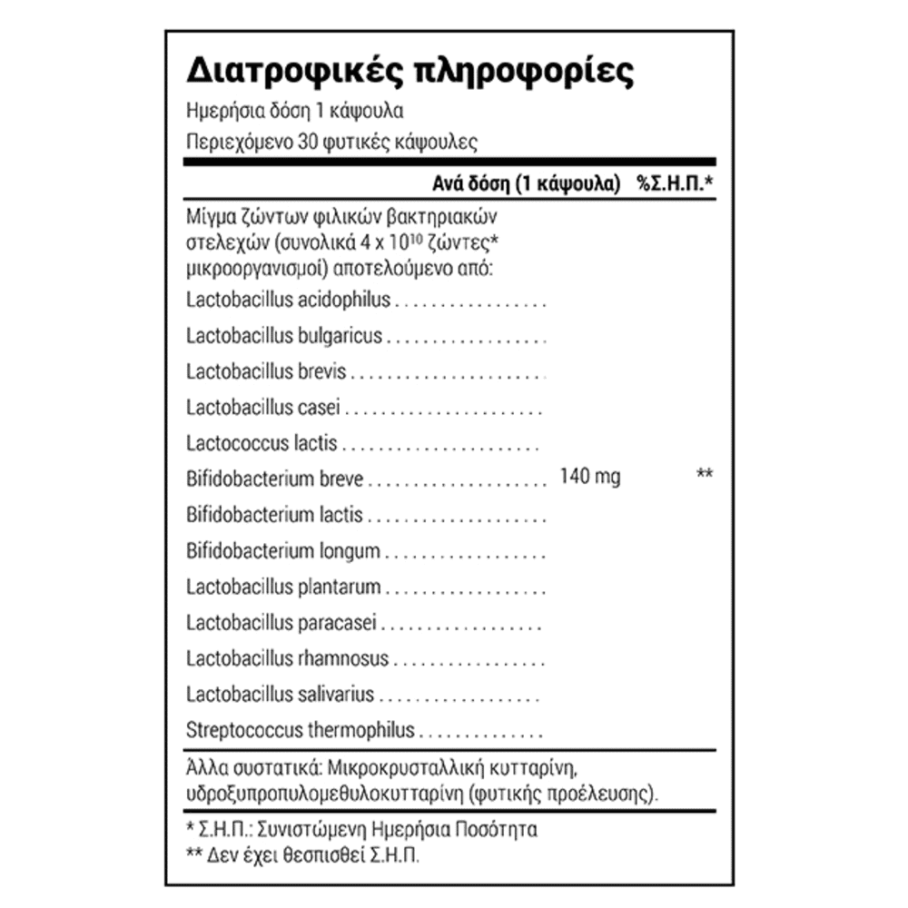 αποτελούµενο από: Lactobacillus acidophilus, Lactobacillus bulgaricus, Lactobacillus brevis, Lactobacillus casei, Lactococcus Lactis, Bifidobacterium breve, Bifidobacterium lactis 140mg, Bifidobacterium longum, Lactobacillus plantarum, Lactobacillus paracasei, Lactobacillus rhamnosus, Lactobacillus salivarius, Streptococcus thermophilus