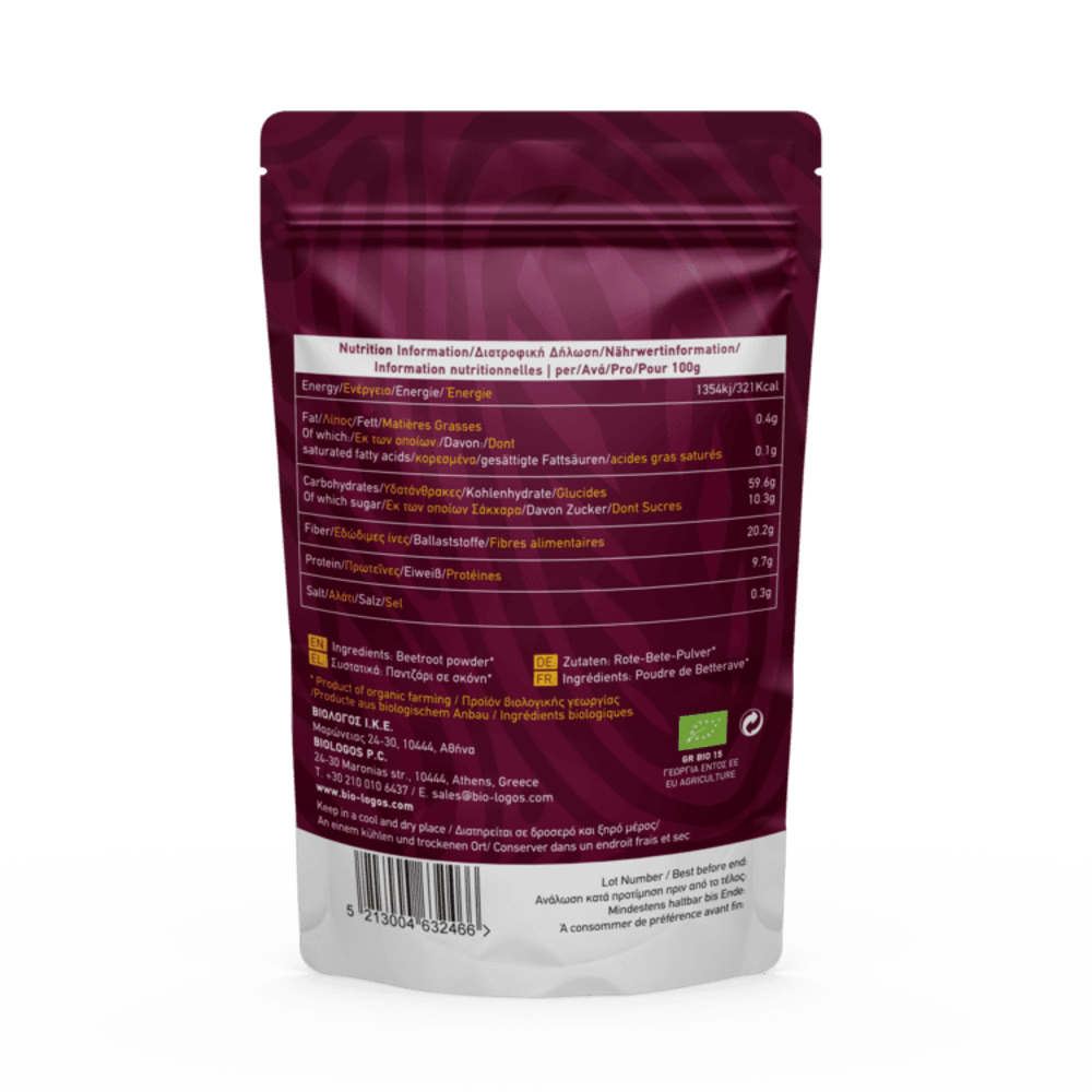 Η σκόνη παντζαριού είναι ένα θρεπτικό superfood γεμάτο με βιταμίνες, μέταλλα και αντιοξειδωτικά, που ενισχύει τη φυσική ευεξία και υποστηρίζει την υγεία του οργανισμού. Πλούσιο σε σίδηρο, μαγνήσιο, βιταμίνες του συμπλέγματος B και φυλλικό οξύ, το παντζάρι βοηθά στην αύξηση της ενέργειας, τη βελτίωση της κυκλοφορίας του αίματος και την ενίσχυση της αντοχής. Το παντζάρι είναι επίσης γνωστό για τις αντιφλεγμονώδεις και αποτοξινωτικές του ιδιότητες, υποστηρίζοντας την υγεία του καρδιοαγγειακού συστήματος και την απομάκρυνση τοξινών από τον οργανισμό. Η σκόνη παντζαριού μπορεί να προστεθεί σε smoothies, χυμούς, σούπες ή ακόμα και σε αρτοσκευάσματα, προσφέροντας πλούσια γεύση και όλα τα οφέλη του φρέσκου παντζαριού με ευκολία και πρακτικότητα στην καθημερινή σας διατροφή.